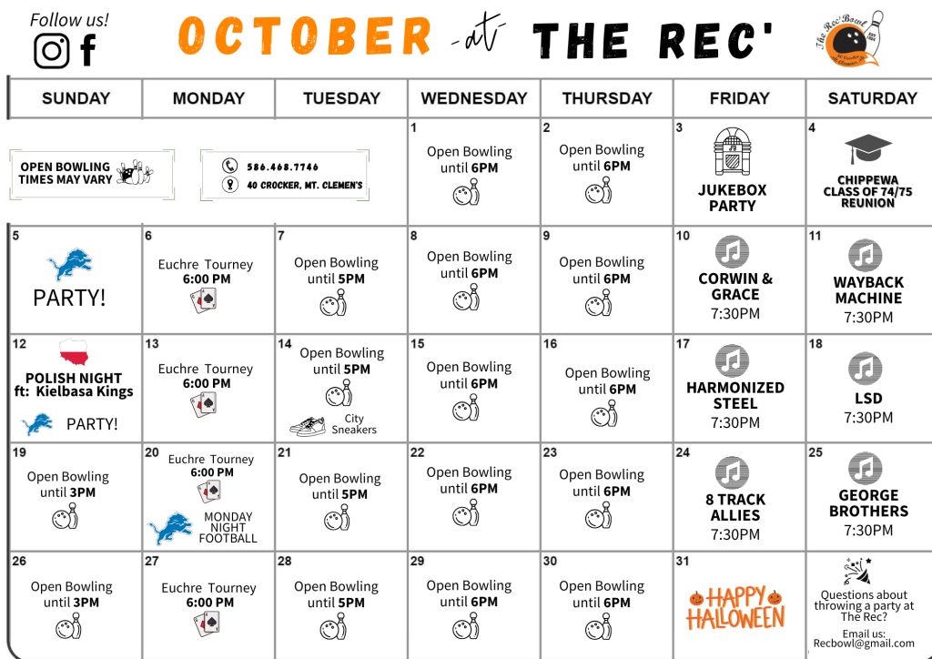 The Rec Bowl is, and will continue to be, a legendary staple of Downtown Mount Clemens. We are a host to some of the areas finest events and entertainment. Our retro, masterfully maintained, eight-lane bowling alley is ready for the good times.